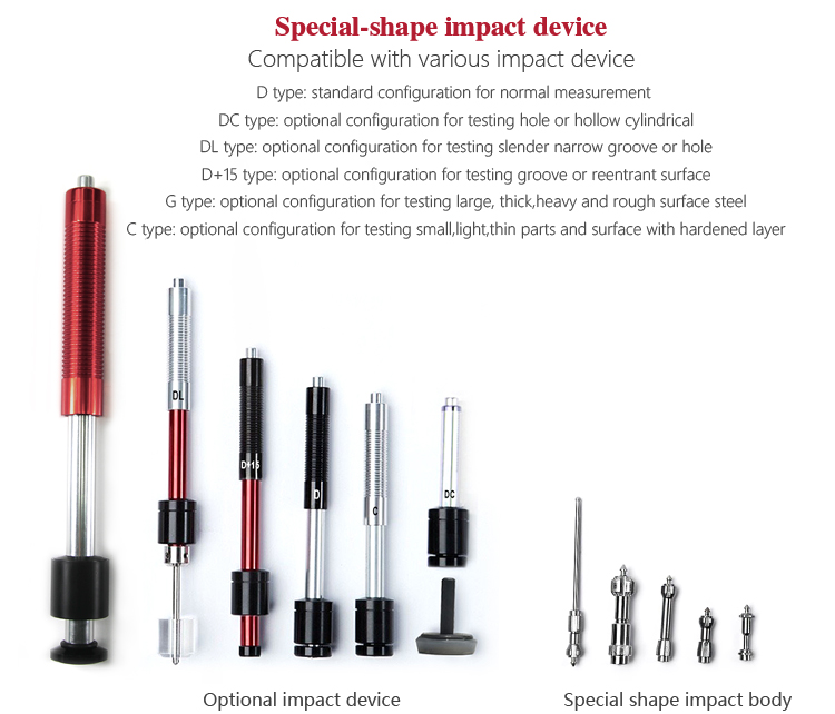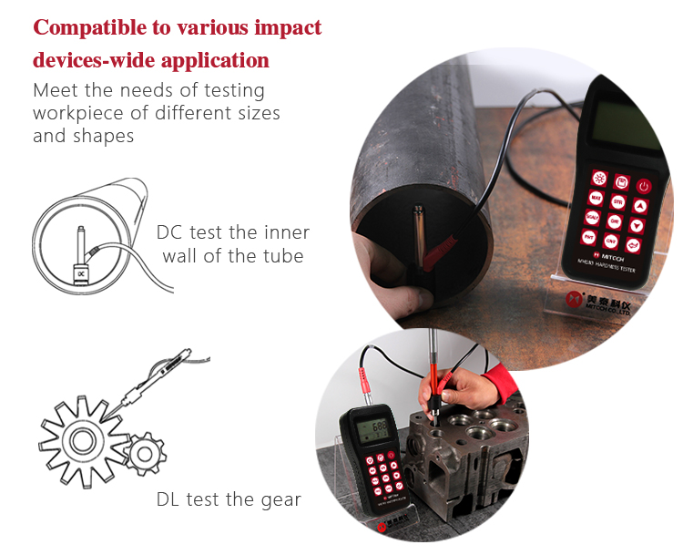 The DL type impact device of Mitech portable hardness tester, height 204mm, weight 50g, diameter 20mm, has build-in DL impact body, front side is slim device, it is suitable for hardness measurement of the narrow parts (like holes, slits) of the workpiece with weight above 5kg, thickness above 5mm. It is widely used for the narrow part of the installed machinery or permanently assembled parts, rapidly testing for multiple measuring parts in large range of the large-scale workpiece, hardness testing for gear tooth root and other slender narrow grooves or hole. It can realize the precise measurements for Leeb, Brinell, Rockwell and others. | |