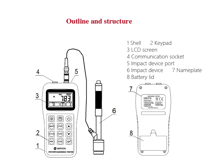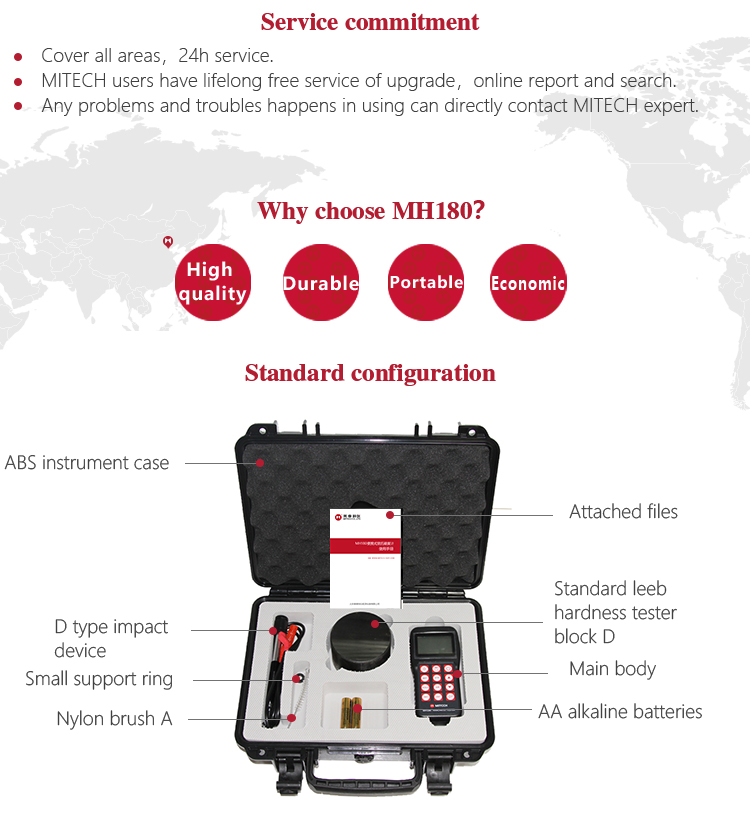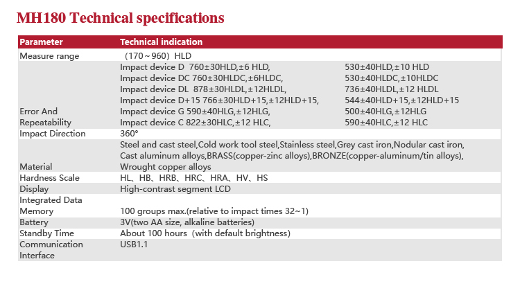 MH180 portable Leeb hardness tester, based on Leeb hardness measuring principle, quick and easy,on-site test the hardness of series metal materials, support free conversion between Leeb, Brinell, Rockwell hardness scale and others,It uses high-contrast segment LCD to display , small size, light,portable, stable and reliable performance.It is widely used in failure analysis of metal processing and manufacturing, special equipment, permanent assembly, inspection and other fields.It can meet the regular hardness testing of industrial production , quality and cheap, which is the first choice for practical and economical models.