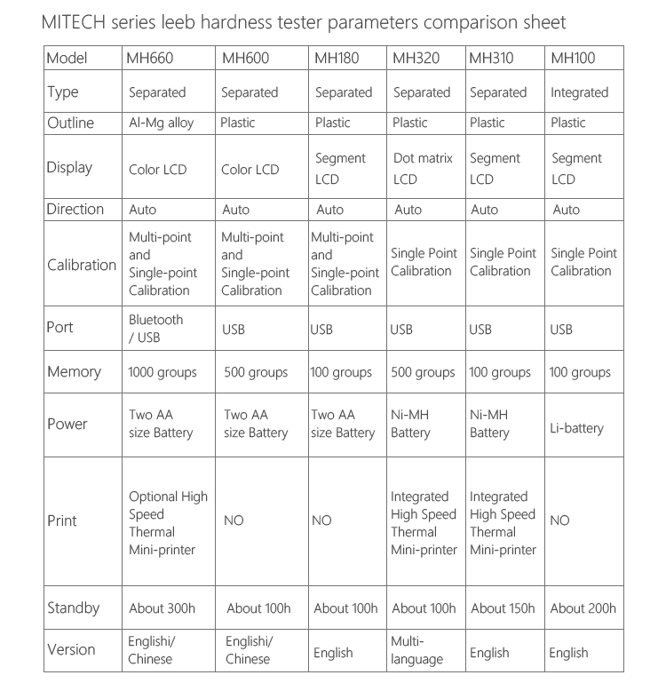 Mitech portable Leeb hardness testers,with low-power consumption design and long standby, MH180/MH200/MH600/MH660 all adopt two AA size alkaline batteries for power supply. | |
