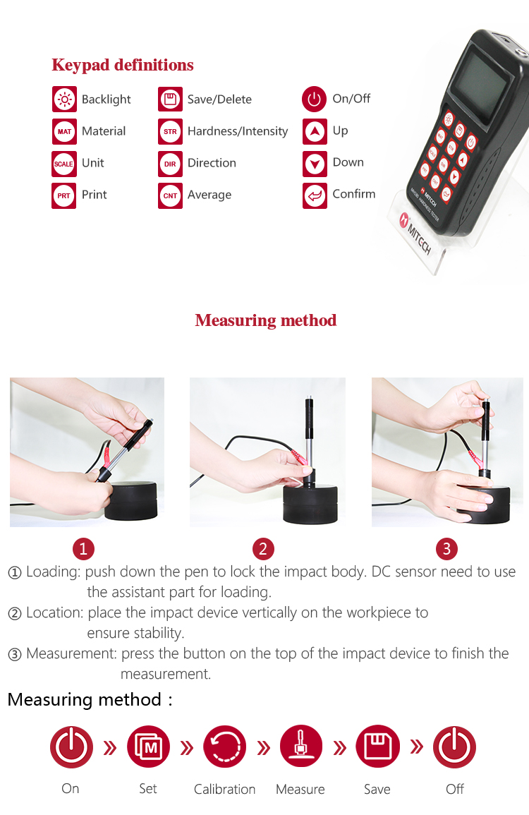 The DC type impact device of Mitech portable hardness tester,height: 86mm, weight: 50g,diameter: 20mm, has build-in DC impact body. The load device of the impact body is designed at the outside of the impact device. With small volume, DC type impact device is suitable for hardness measurement of the marrow parts (like holes, slits) of the workpiece with weight above 5kg, thickness above 5mm. It is widely used for the narrow parts of the installed machinery or permanently assembled parts, rapidly testing for multiple measuring parts in large range of the large-scale workpiece, hardness testing for gear tooth root and other slender narrow grooves or hole. It can realize the precise measurements for Leeb, Brinell, Rockwell and others. | |