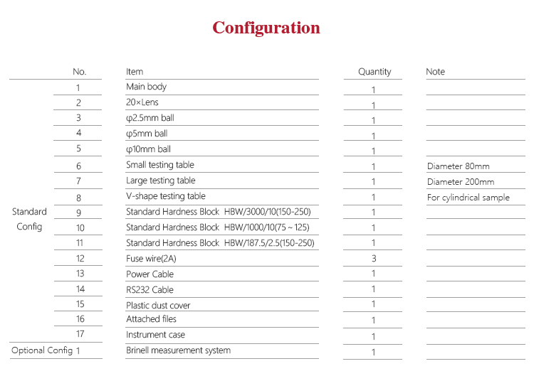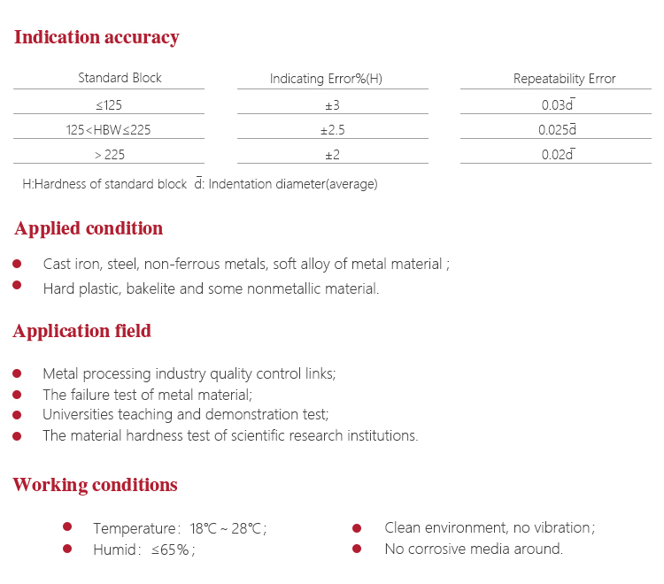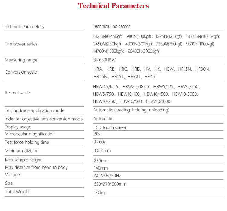 Brinell scale | HBW2.5/62.5、HBW2.5/187.5、HBW5/125、HBW5/250、 HBW5/750、HBW10/100、HBW10/1500、HBW10/3000、 HBW10/250、HBW1 |