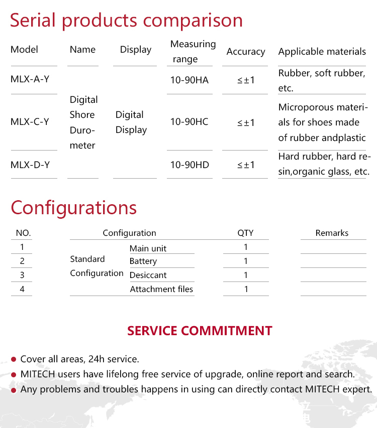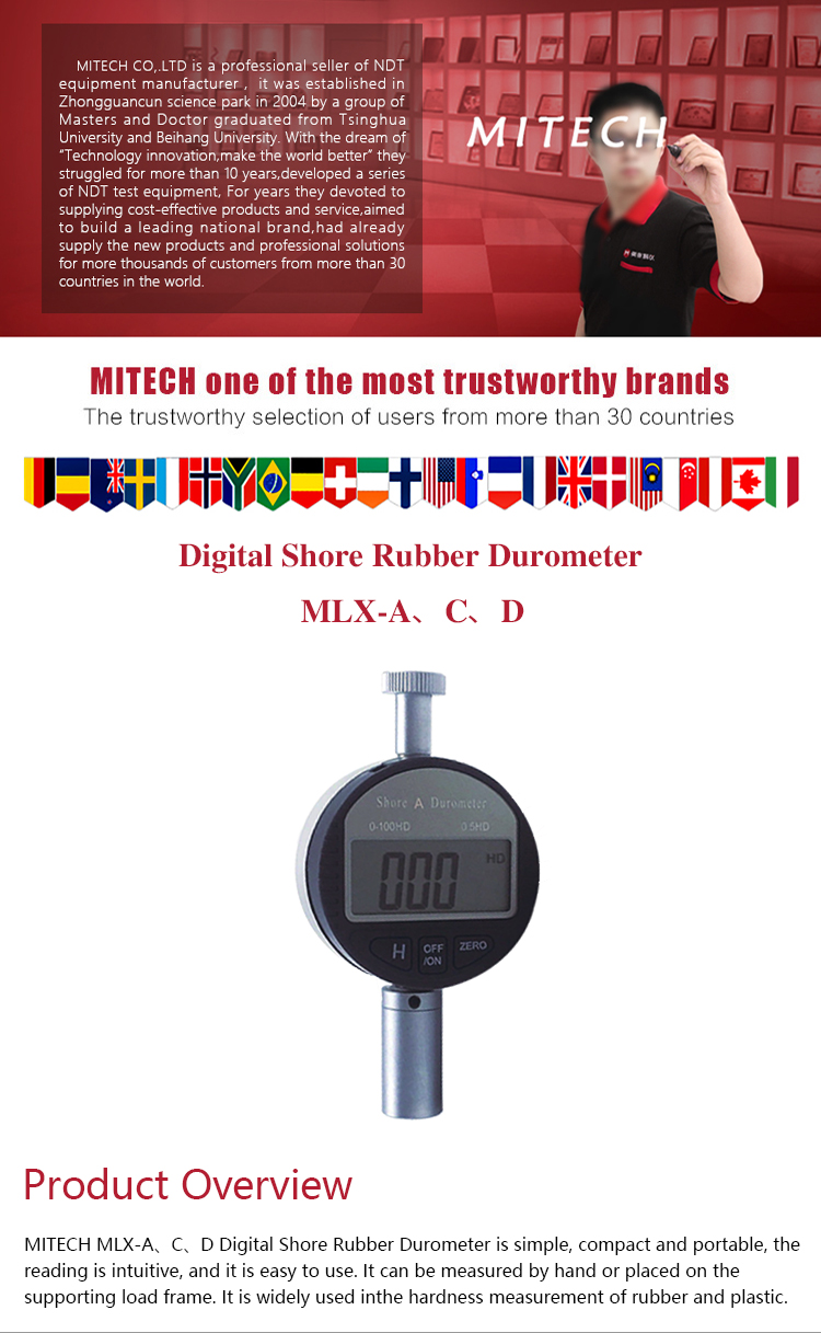 MITECH MLX-A、CD Digital Shore Rubber Durometer is simple, compact and portable, the reading is intuitive, and it is easy to use. It can be measured by hand or placed on the supporting load frame. It is widely used in the hardness measurement of rubber and plastic.