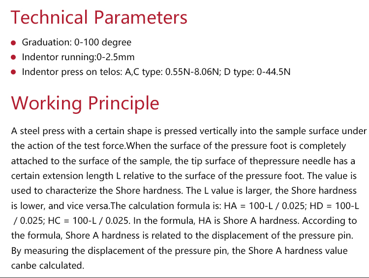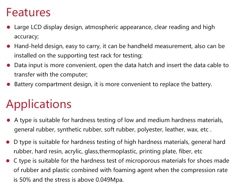 • C type is suitable for the hardness test of microporous materials for shoes made of rubber and plastic combined with foaming agent when the compression rate is 50% and the stress is above 0.049Mpa.