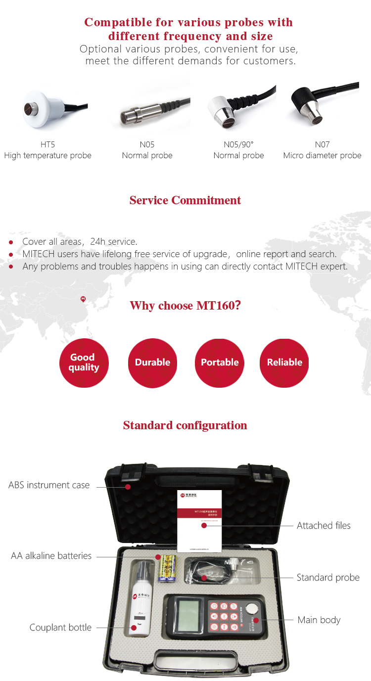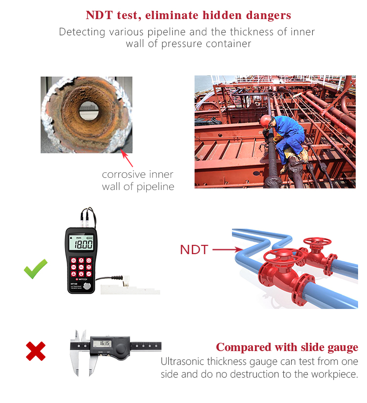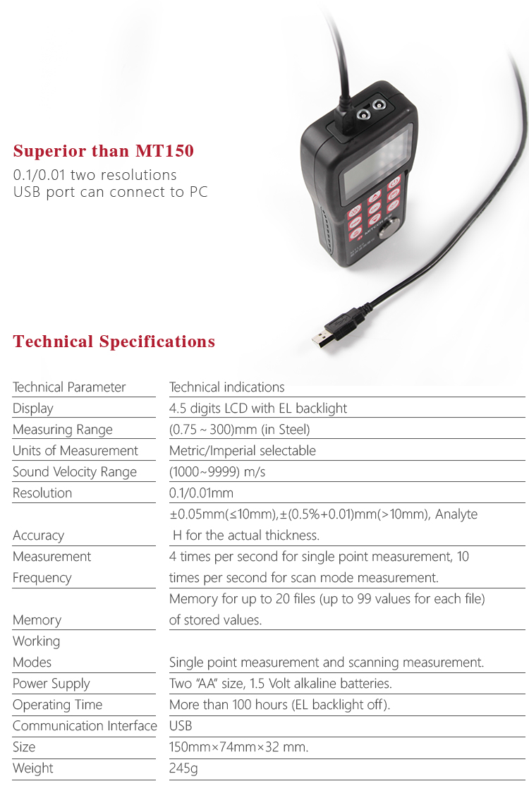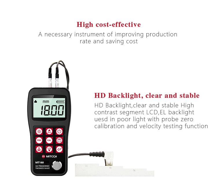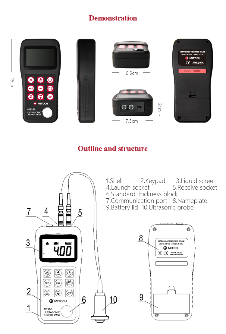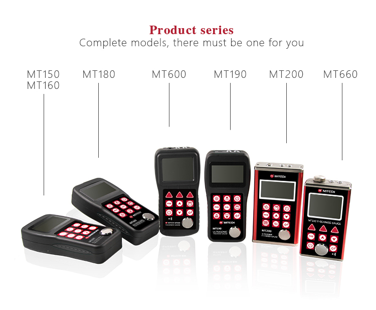 The model MT160 is a digital ultrasonic thickness gauge .Based on the principle of ultrasonic principle, the instrument is capable of measuring the thickness of various materials, such as metal, plastic, ceramic, glass and many other good ultrasonic conductors. It of all kinds of materials. Compared with the traditional measurement methods, the advantages of ultrasonic thickness gauge is exposed to one side of the workpiece to complete the measurement. Its unique non-destructive testing performance provide the perfect solution for the thickness testing of closed pipes, containers, etc. It is widely used in pertroleum , chemical ,metallurgy, shipbuilding, aviation, aerospace and other fields because of monitoring corrosion thinning degree of various pipes and pressure vessels. It can also be used for precise measurement of sheet metal and machined parts.