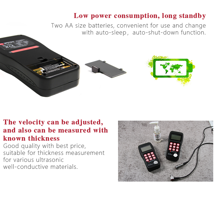 Mitech series ultrasonic thickness gauges, with low-power design and long standby, MT150/MT160/MT200/MT180/MT190/MT600/MT660 are with two AA size alkaline batteries for power supply, easy to replace.
