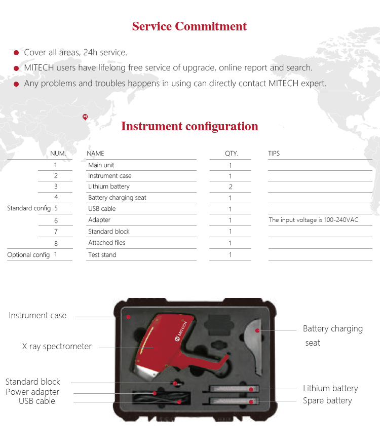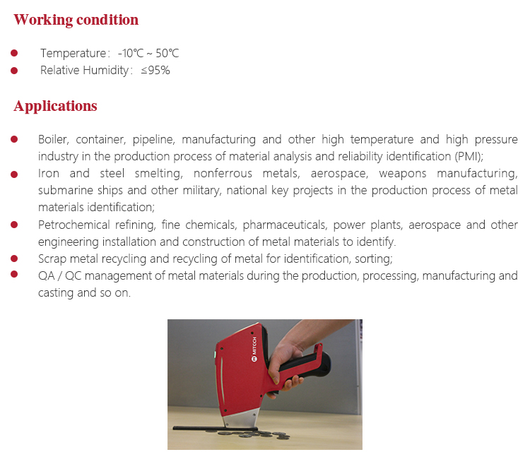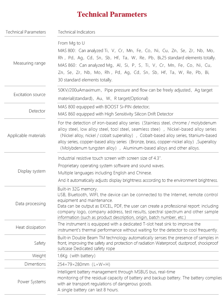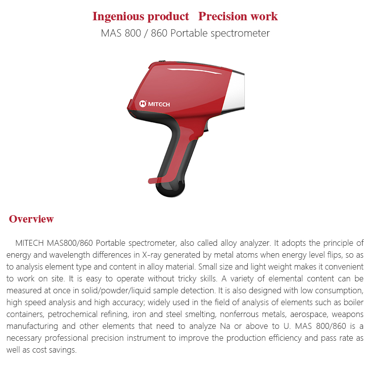 MITECH MAS860 Portable spectrometer, also called alloy analyzer. It adopts the principle of energy and wavelength differences in X-ray generated by metal atoms when energy level flips, so as to analysis element type and content in alloy material. Small size and light weight makes it convenient to work on site. It is easy to operate without tricky skills. A variety of elemental content can be measured at once in solid/powder/liquid sample detection. It is also designed with low consumption, high speed analysis and high accuracy; widely used in the field of analysis of elements such as boiler containers, petrochemical refining, iron and steel smelting, nonferrous metals, aerospace, weapons manufacturing and other elements that need to analyze Na or above to U. MAS 860 is a necessary professional precision instrument to improve the production efficiency and pass rate as well as cost savings.