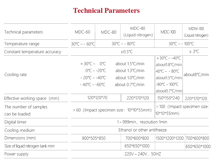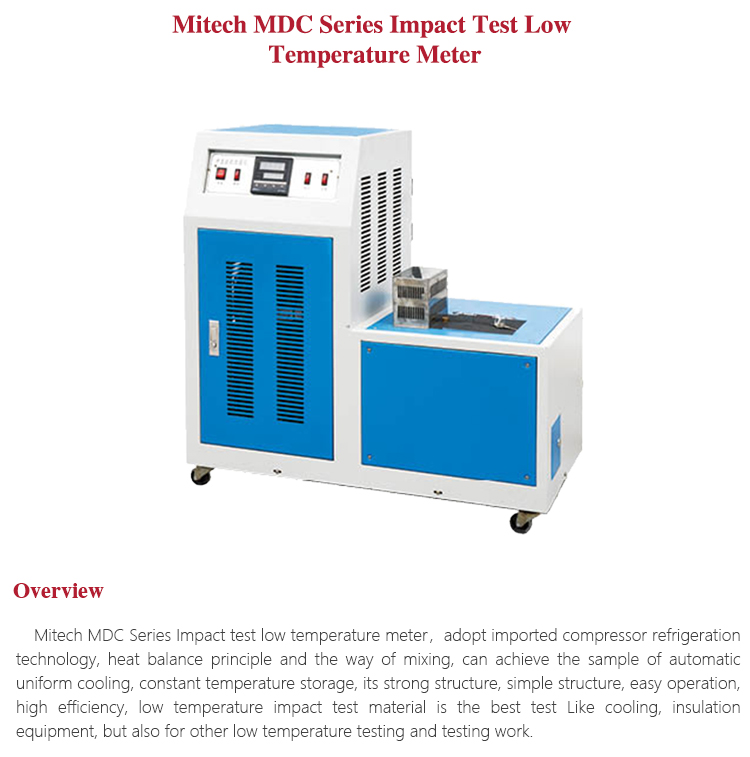 Mitech MDC Series Impact test low temperature meter,adopt imported compressor refrigeration technology, heat balance principle and the way of mixing, can achieve the sample of automatic uniform cooling, constant temperature storage, its strong structure, simple structure, easy operation, high efficiency, low temperature impact test material is the best test Like cooling, insulation equipment, but also for other low temperature testing and testing work.