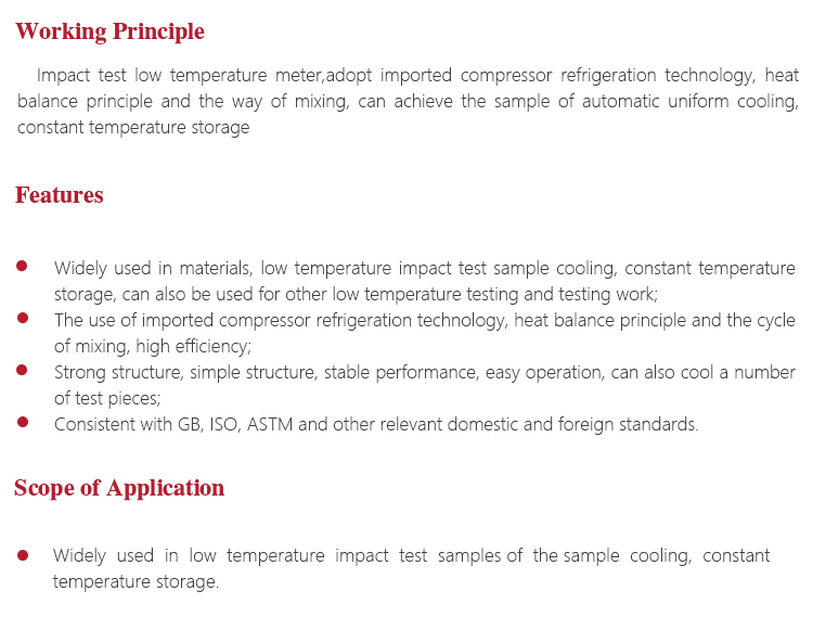 Impact test low temperature meter,adopt imported compressor refrigeration technology, heat balance principle and the way of mixing, can achieve the sample of automatic uniform cooling, constant temperature storage