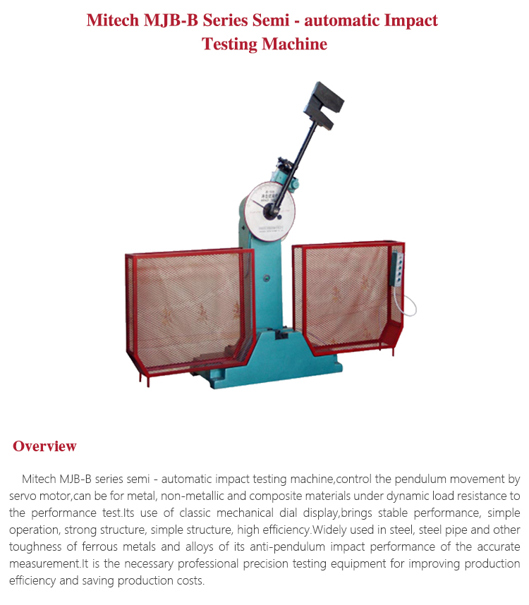 Mitech MJB-B series semi - automatic impact testing machine ,control the pendulum movement by servo motor,can be for metal, non-metallic and composite materials under dynamic load resistance to the performance test.Its use of classic mechanical dial display,brings stable performance, simple operation, strong structure, simple structure, high efficiency.Widely used in steel, steel pipe and other toughness of ferrous metals and alloys of its anti-pendulum impact performance of the accurate measurement.It is the necessary professional precision testing equipment for improving production efficiency and saving production costs.