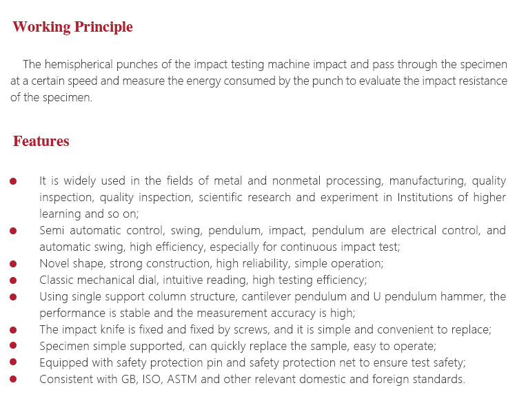 The hemispherical punches of the impact testing machine impact and pass through the specimen at a certain speed and measure the energy consumed by the punch to evaluate the impact resistance of the specimen.