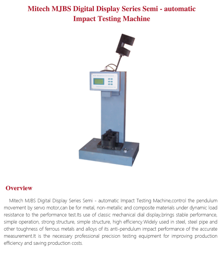 Mitech MJBS Digital Display Series Semi - automatic Impact Testing Machine,control the pendulum movement by servo motor,can be for metal, non-metallic and composite materials under dynamic load resistance to the performance test.Its use of classic mechanical dial display,brings stable performance, simple operation, strong structure, simple structure, high efficiency.Widely used in steel, steel pipe and other toughness of ferrous metals and alloys of its anti-pendulum impact performance of the accurate measurement.It is the necessary professional precision testing equipment for improving production efficiency and saving production costs.