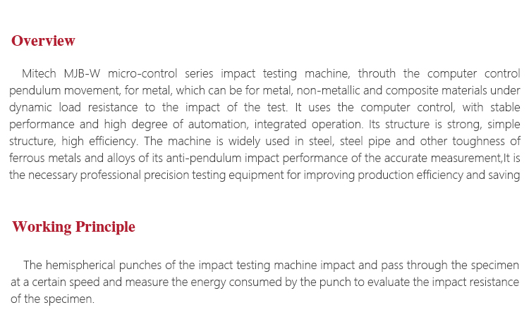 Mitech MJB-W micro-control series impact testing machine, throuth the computer control pendulum movement, for metal, which can be for metal, non-metallic and composite materials under dynamic load resistance to the impact of the test. It uses the computer control, with stable performance and high degree of automation, integrated operation. Its structure is strong, simple structure, high efficiency. The machine is widely used in steel, steel pipe and other toughness of ferrous metals and alloys of its anti-pendulum impact performance of the accurate measurement,It is the necessary professional precision testing equipment for improving production efficiency and saving production costs.