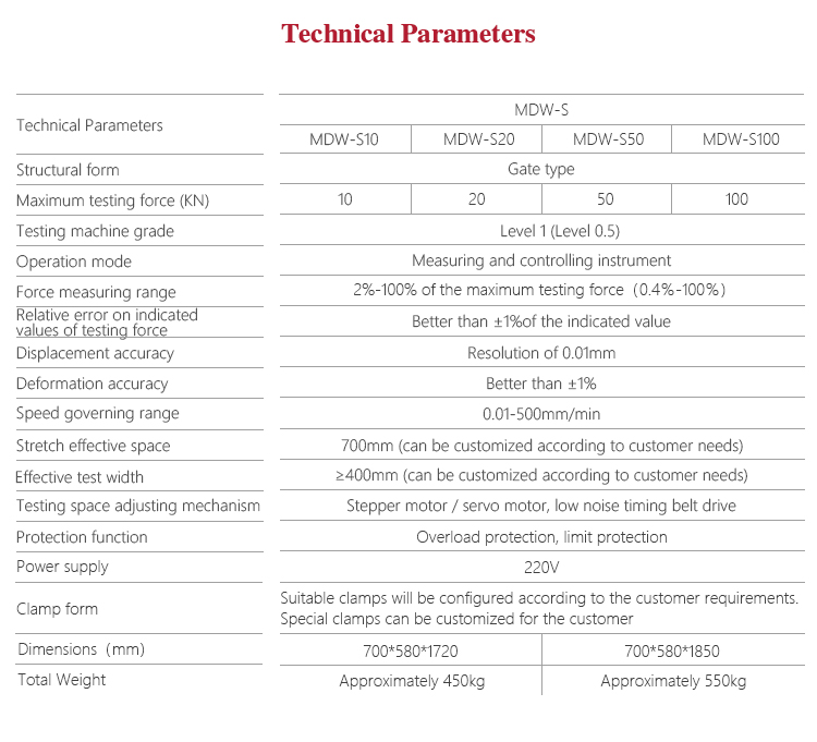 Mitech MDW-S digital display series gate type electronic universal testing machine,through the single-chip automatic control motor driving screw movement, equipped with the corresponding auxiliary for metal, non-metallic and composite materials for pull, pressure, bending and other mechanical properties test.( The tensile test is carried out between the upper beam of the main body and the moving beam, and the compression and bending tests are carried out between the main plate and the moving beam. ),it use of built-in controller, AC servo motor, automatic control and data acquisition system, stable performance, strong structure, high reliability, simple operation, high degree of automation. Widely used in metal and non-metallic processing industry, quality inspection departments quality testing, scientific research and other areas of higher education institutions, is to improve production efficiency and save production costs necessary professional precision testing equipment.