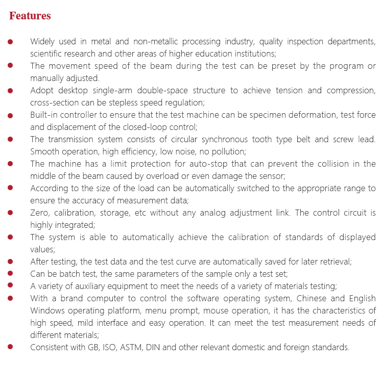 Mitech MDW micro control series single-arm electronic tensile testing machine, through the computer control motor drive screw, equipped with the corresponding auxiliary for metal, non-metallic and composite materials for pull, pressure, bending and other mechanical properties test (Tensile test carried out between the upper beam of the main body and the moving beam. Compression and bending tests carried out between the table of the host and the moving beam). It’s adopts the built-in controller, AC servo motor, by computer-aided means to achieve powerful function with stable performance, strong structure, high reliability, simple operation, high degree of automation. It’s widely used in metal and non-metallic processing industry, quality inspection departments, scientific research and other areas of higher education institutions and it’s a necessary professional precision testing equipment for improve production efficiency and save production costs.