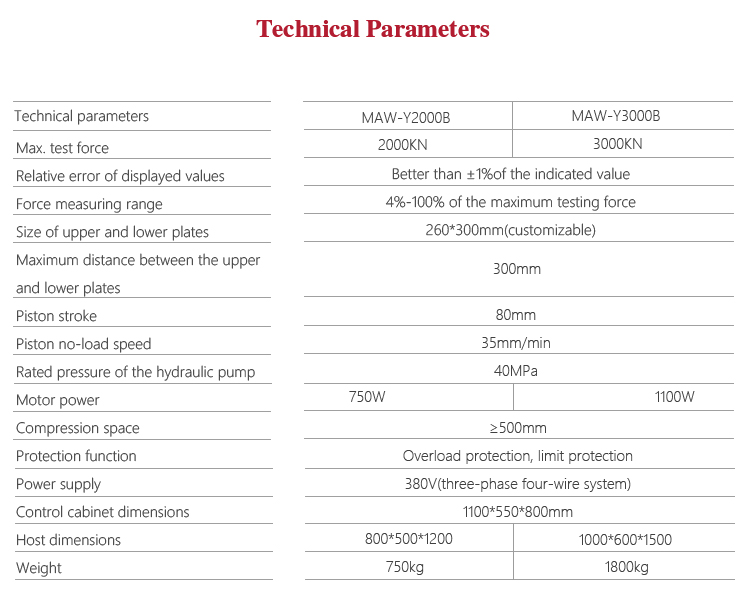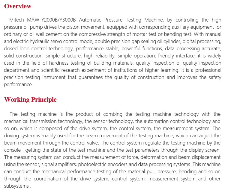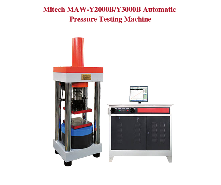 Mitech MAW-Y3000B Automatic Pressure Testing Machine, by controlling the high pressure oil pump drives the piston movement, equipped with corresponding auxiliary equipment for ordinary or oil well cement on the compressive strength of mortar test or bending test. With manual and electric hydraulic servo control mode, double precision gap sealing oil cylinder, digital processing, closed loop control technology, performance stable, powerful functions, data processing accurate, solid construction, simple structure, high reliability, simple operation, friendly interface, it is widely used in the field of hardness testing of building materials, quality inspection of quality inspection department and scientific research experiment of institutions of higher learning. It is a professional precision testing instrument that guarantees the quality of construction and improves the safety performance.