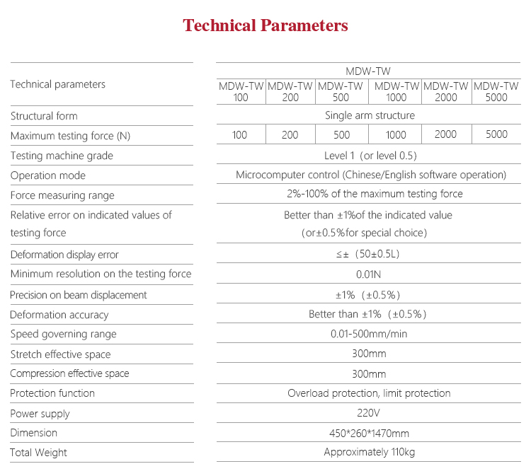 Mitech MDW-TW micro control series Single-arm Spring Tension/Compression Testing Machine, through the single-chip automatic control motor driving screw movement, for a variety of coil springs for tensile and compression test. It’s adopts the built-in controller, AC servo motor, by computer-aided means to achieve powerful function with stable performance, strong structure, high reliability, simple operation, high degree of automation. Widely used in spring manufacturing, low-voltage electrical appliances, power machinery, institutions of higher learning and scientific research institutes and other fields.It is the necessary professional precision testing equipment for improving production efficiency and saving production costs.