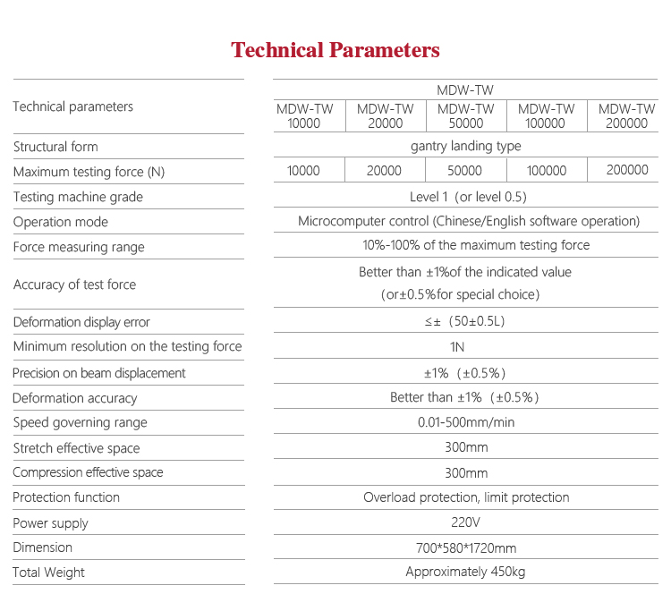 Mitech MDW-TW micro-control series gantry landing type spring tension and compression testing machine,by microcomputer control motor drive screw motion, for a wide variety of spring tension and compression experiment was carried out, it adopts the built-in controller, AC servo motor, stable performance, strong structure, high reliability, simple operation and high degree of automation. Computer-aided means to achieve powerful functionality. Widely used in spring manufacturing, low-voltage electrical appliances, power machinery, institutions of higher learning and scientific research units and other fields.It is the necessary professional precision testing equipment for improving production efficiency and saving production costs.