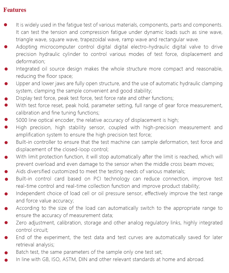 <!--[if !supportLists]-->l <!--[endif]-->It is widely used in the fatigue test of various materials, components, parts and components. It can test the tension and compression fatigue under dynamic loads such as sine wave, triangle wave, square wave, trapezoidal wave, ramp wave and rectangular wave.