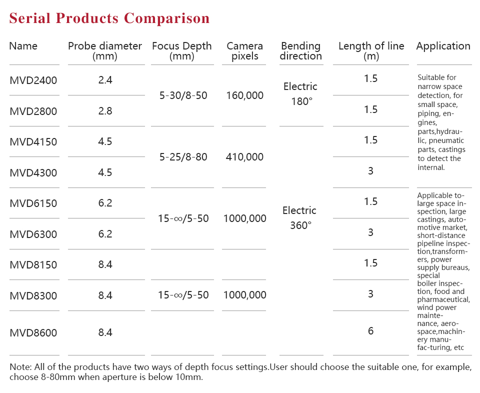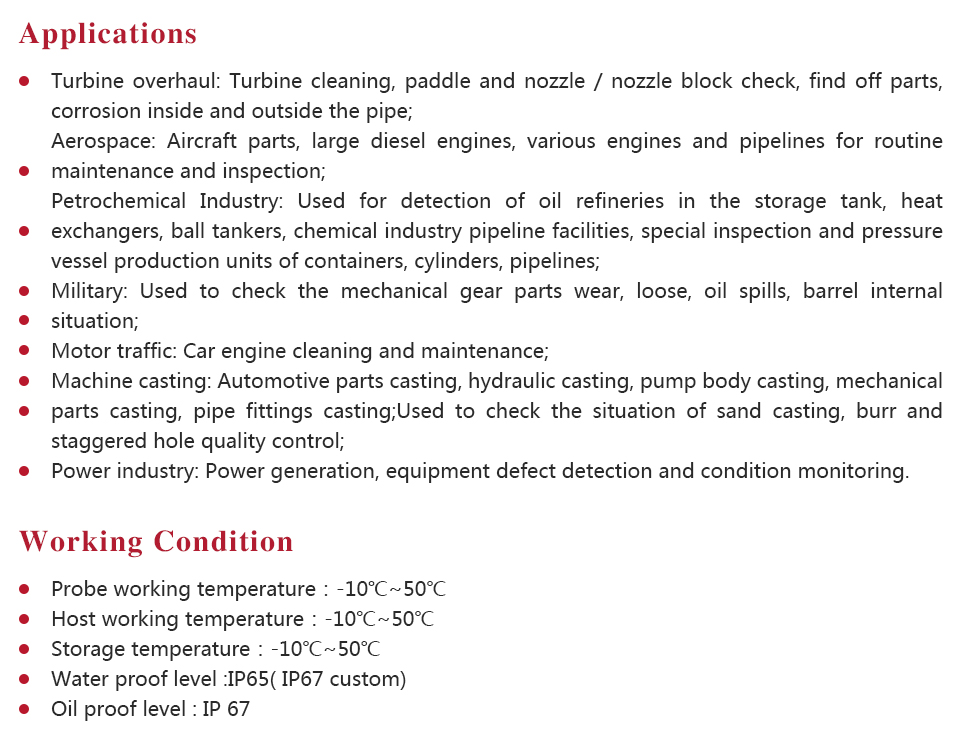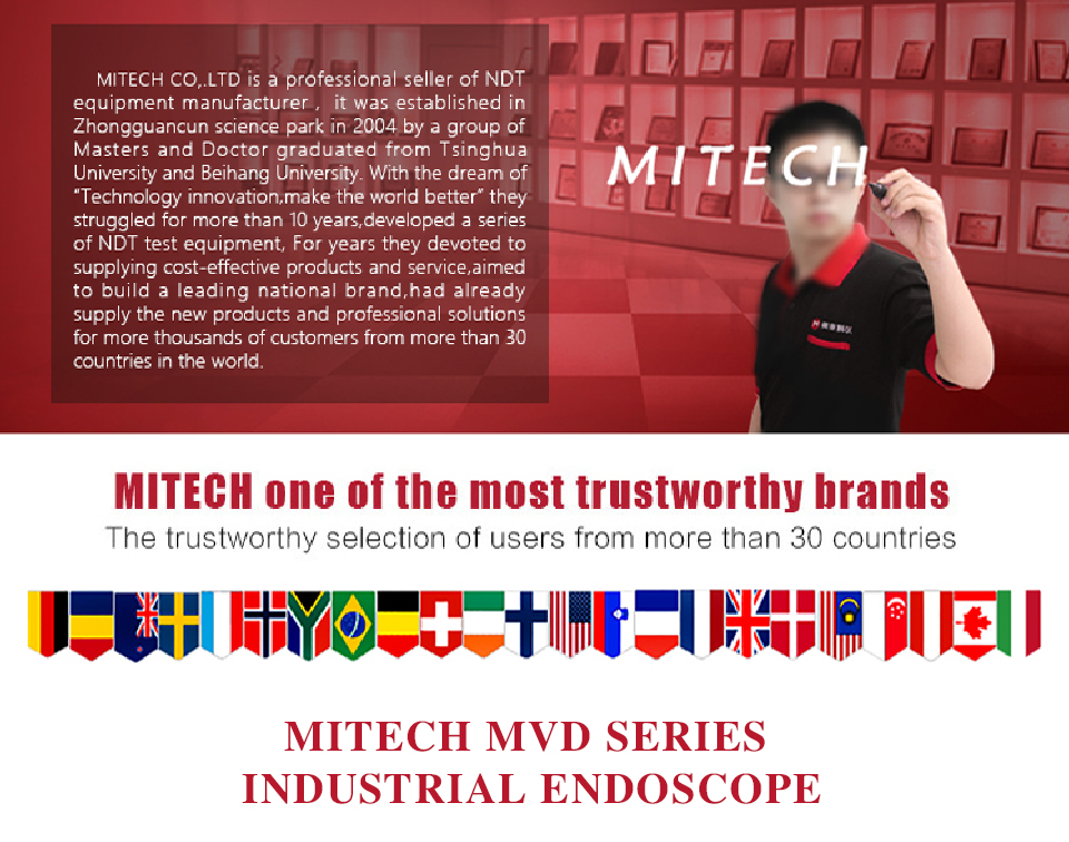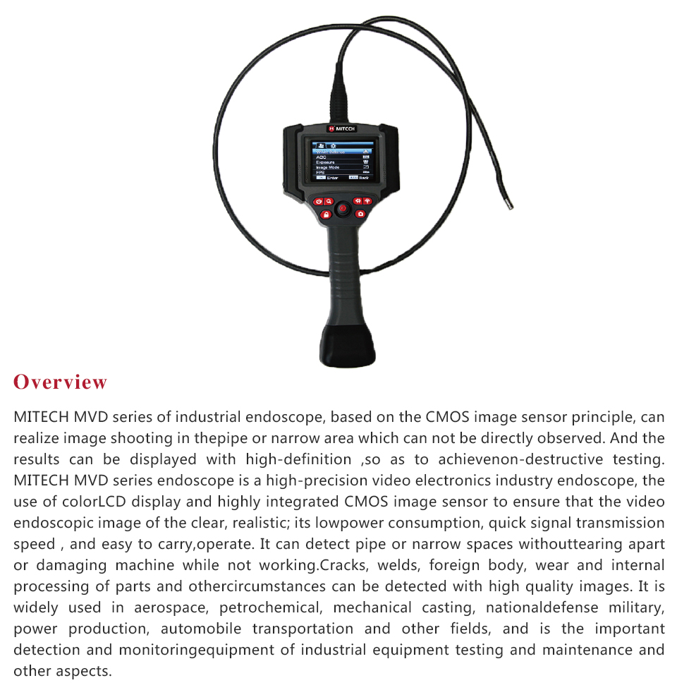 MITECH MVD series of industrial endoscope, based on the CMOS image sensor principle, can realize image shooting in the pipe or narrow area which can not be directly observed. And the results can be displayed with high-definition ,so as to achieve non-destructive testing. MITECH MVD series endoscope is a high-precision video electronics industry endoscope, the use of color LCD display and highly integrated CMOS image sensor to ensure that the video endoscopic image of the clear, realistic; its low power consumption, quick signal transmission speed , and easy to carry,operate. It can detect pipe or narrow spaces without tearing apart or damaging machine while not working.Cracks, welds, foreign body, wear and internal processing of parts and other circumstances can be detected with high quality images. It is widely used in aerospace, petrochemical, mechanical casting, national defense military, power production, automobile transportation and other fields, and is the important detection and monitoring equipment of industrial equipment testing and maintenance and other aspects.