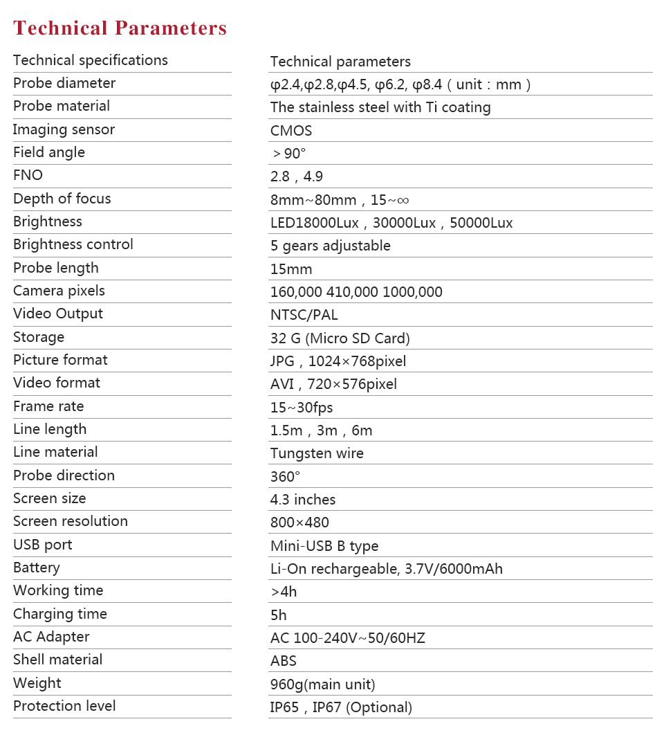 MITECH MVD series of industrial electronic endoscope, built-in CMOS high sensitivity image sensor, the highest imaging pixels up to 100 million, clear and stable.Also designed with three different detecting line(1.5m, 3m, 6m),matched with 4.5mm, 6.2mm, 8.4mm three kinds of probes that can adapt to different sizes of aperture and detection length requirements. The instrument weights 960g and is the standard configuration of MVD industrial endoscope.It is mainly used to detect corrosion, cracks, welds, foreign objects, wear and internal processing of various industrial pipelines or complex and small equipment. It is an important detection and monitoring instrument in the detection and maintenance of industrial equipment.