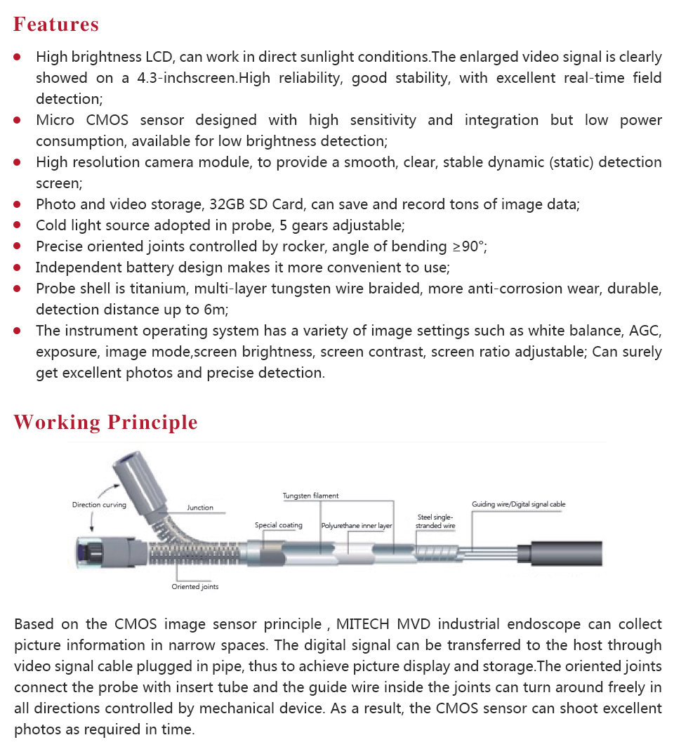 Based on the CMOS image sensor principle,MITECH MVD industrial endoscope can collect picture information in narrow spaces. The digital signal can be transferred to the host through video signal cable plugged in pipe, thus to achieve picture display and storage.The oriented joints connect the probe with insert tube and the guide wire inside the joints can turn around freely in all directions controlled by mechanical device. As a result, the CMOS sensor can shoot excellent photos as required in time.