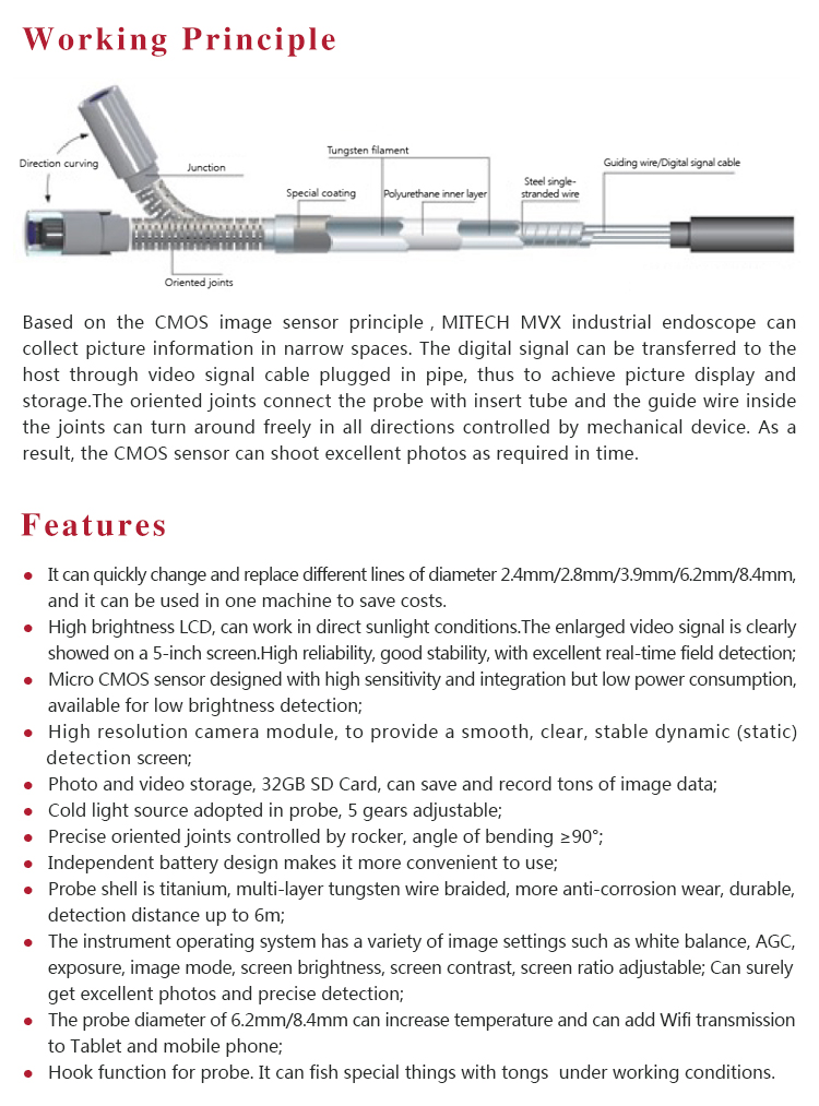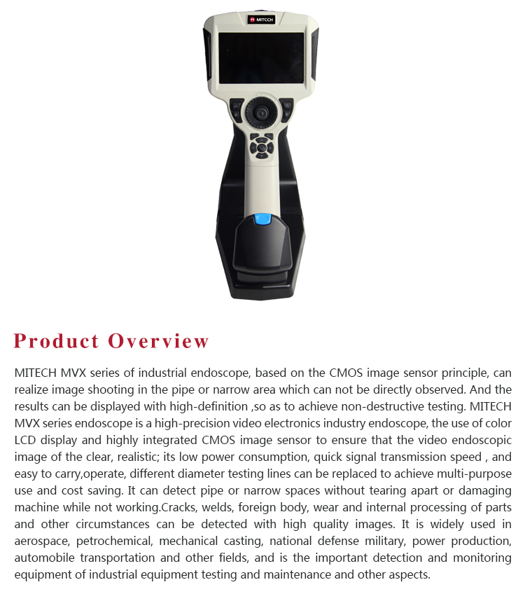 MITECH MVX series of industrial endoscope, based on the CMOS image sensor principle, can realize image shooting in the pipe or narrow area which can not be directly observed. And the results can be displayed with high-definition ,so as to achieve non-destructive testing. MITECH MVX series endoscope is a high-precision video electronics industry endoscope, the use of color LCD display and highly integrated CMOS image sensor to ensure that the video endoscopic image of the clear, realistic; its low power consumption, quick signal transmission speed , and easy to carry,operate, different diameter testing lines can be replaced to achieve multi-purpose use and cost saving. It can detect pipe or narrow spaces without tearing apart or damaging machine while not working.Cracks, welds, foreign body, wear and internal processing of parts and other circumstances can be detected with high quality images. It is widely used in aerospace, petrochemical, mechanical casting, national defense military, power production, automobile transportation and other fields, and is the important detection and monitoring equipment of industrial equipment testing and maintenance and other aspects.