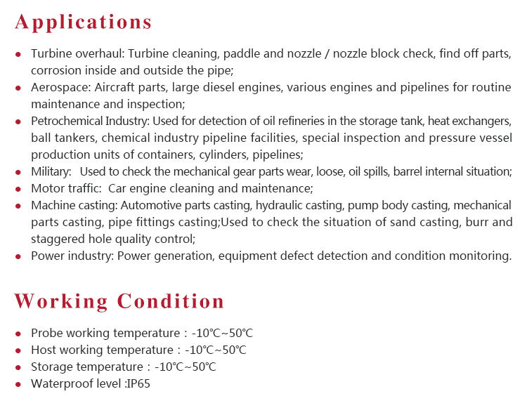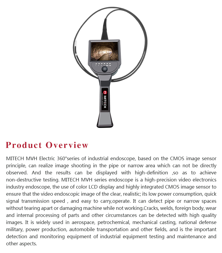 MITECH MVH Electric 360°series of industrial endoscope, based on the CMOS image sensor principle, can realize image shooting in the pipe or narrow area which can not be directly observed. And the results can be displayed with high-definition ,so as to achieve non-destructive testing. MITECH MVH series endoscope is a high-precision video electronics industry endoscope, the use of color LCD display and highly integrated CMOS image sensor to ensure that the video endoscopic image of the clear, realistic; its low power consumption, quick signal transmission speed , and easy to carry,operate. It can detect pipe or narrow spaces without tearing apart or damaging machine while not working.Cracks, welds, foreign body, wear and internal processing of parts and other circumstances can be detected with high quality images. It is widely used in aerospace, petrochemical, mechanical casting, national defense military, power production, automobile transportation and other fields, and is the important detection and monitoring equipment of industrial equipment testing and maintenance and other aspects.