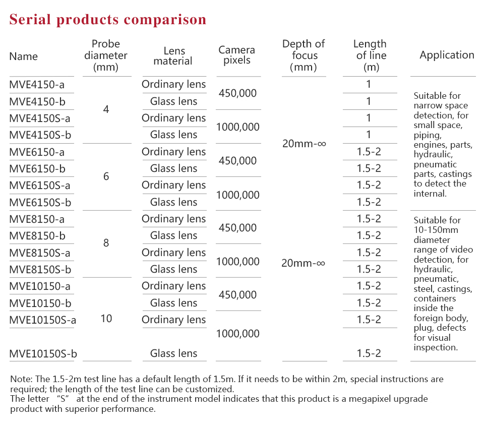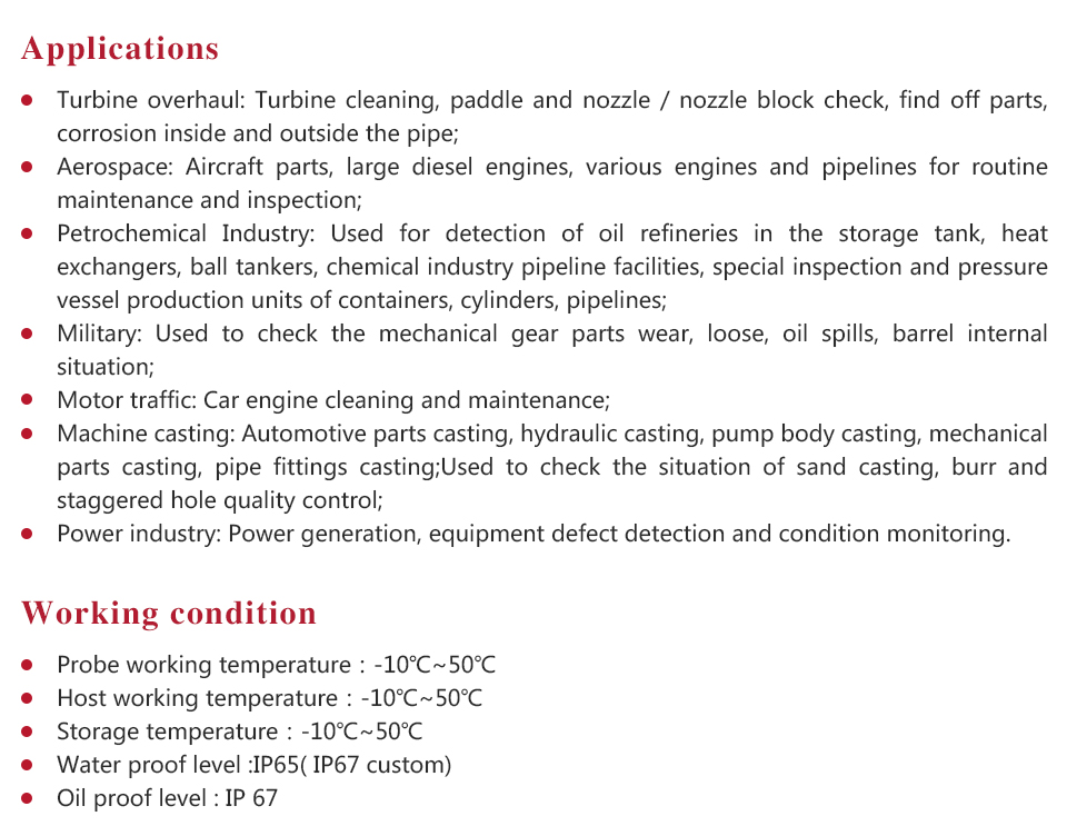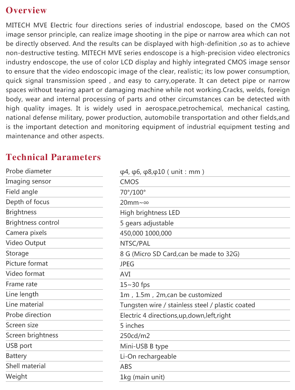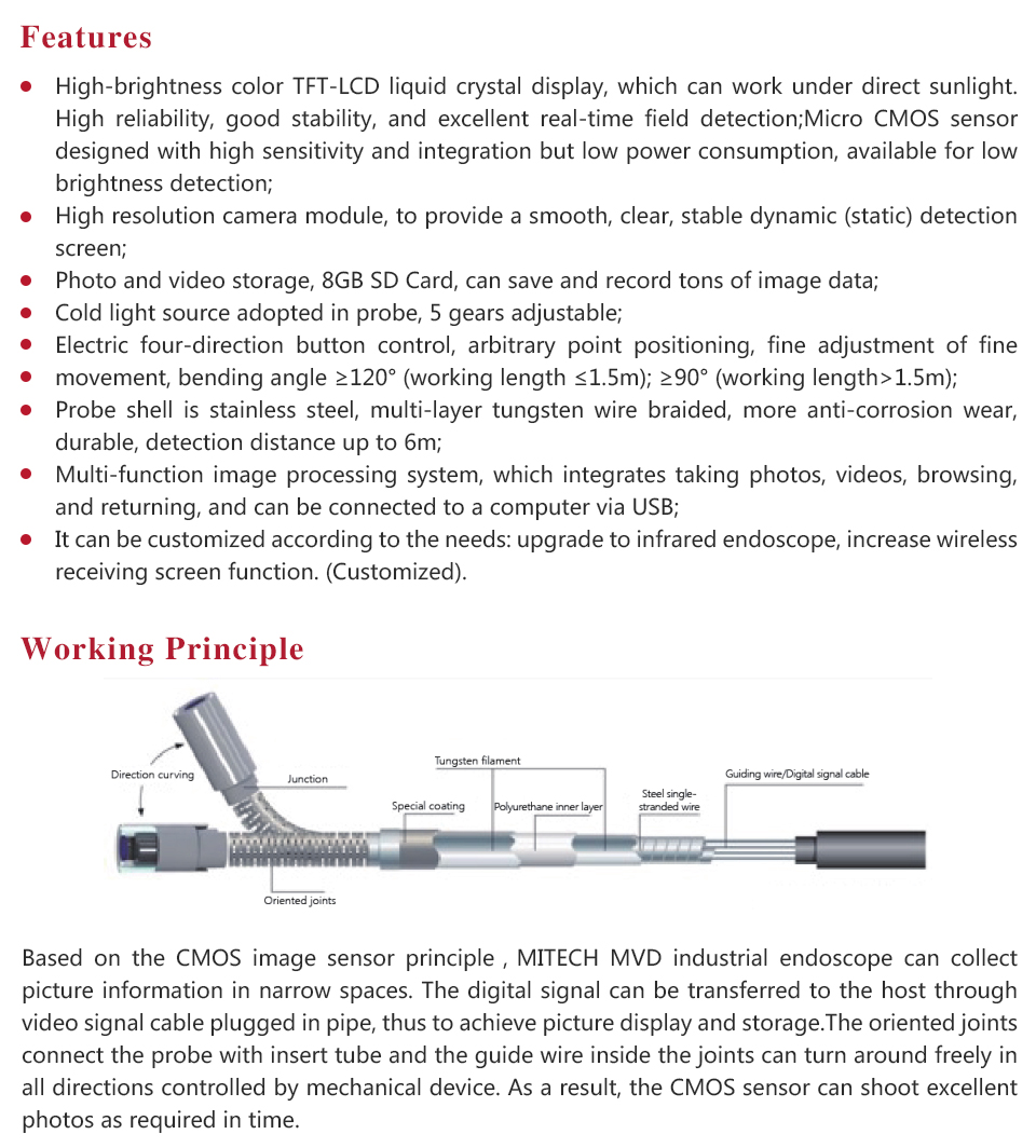 MITECH MVE Electric four directions series of industrial endoscope, based on the CMOS image sensor principle, can realize image shooting in the pipe or narrow area which can not be directly observed. And the results can be displayed with high-definition ,so as to achieve non-destructive testing. MITECH MVE series endoscope is a high-precision video electronics industry endoscope, the use of color LCD display and highly integrated CMOS image sensor to ensure that the video endoscopic image of the clear, realistic; its low power consumption, quick signal transmission speed , and easy to carry,operate. It can detect pipe or narrow spaces without tearing apart or damaging machine while not working.Cracks, welds, foreign body, wear and internal processing of parts and other circumstances can be detected with high quality images. It is widely used in aerospace, petrochemical, mechanical casting, national defense military, power production, automobile transportation and other fields, and is the important detection and monitoring equipment of industrial equipment testing and maintenance and other aspects.