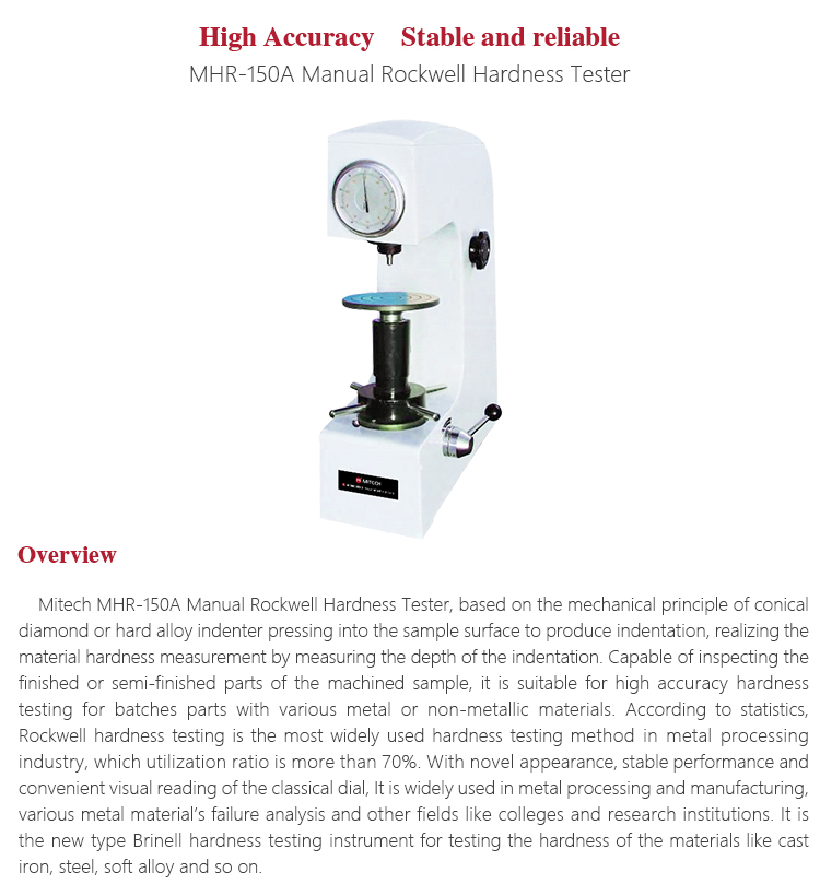 Mitech MHR-150A Manual Rockwell Hardness Tester, based on the mechanical principle of conical diamond or hard alloy indenter pressing into the sample surface to produce indentation, realizing the material hardness measurement by measuring the depth of the indentation. Capable of inspecting the finished or semi-finished parts of the machined sample, it is suitable for high accuracy hardness testing for batches parts with various metal or non-metallic materials. According to statistics, Rockwell hardness testing is the most widely used hardness testing method in metal processing industry, which utilization ratio is more than 70%. With novel appearance, stable performance and convenient visual reading of the classical dial, It is widely used in metal processing and manufacturing, various metal material’s failure analysis and other fields like colleges and research institutions. It is the new type Brinell hardness testing instrument for testing the hardness of the materials like cast iron, steel, soft alloy and so on.