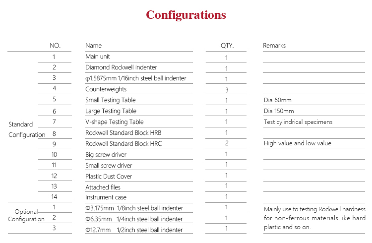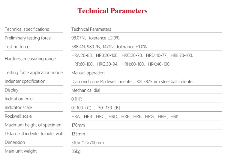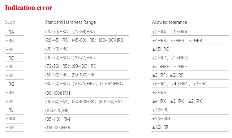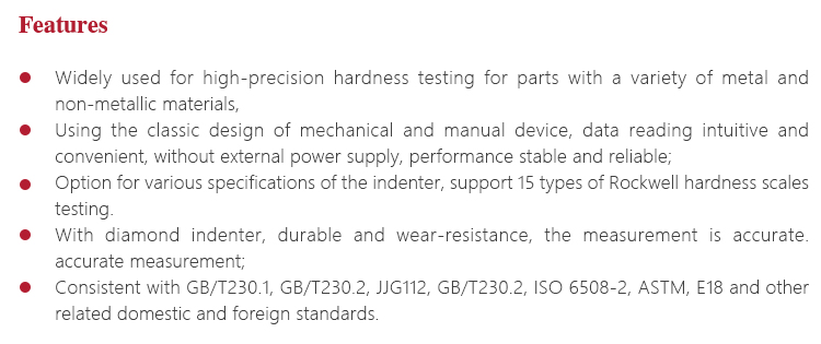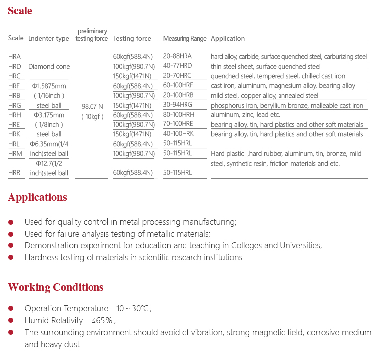 Hardness Measuring range | HRA:20-88、HRB:20-100、HRC:20-70、HRD:40-77、HRE:70-100、 HRF:60-100、HRG:30-94、HRH:80-100、HRK:40-100 |