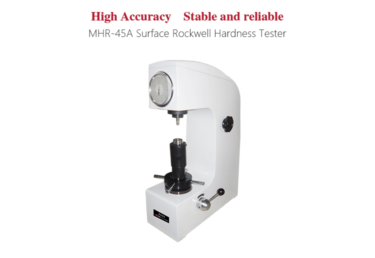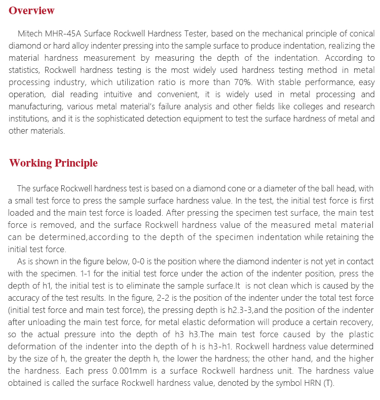 Mitech MHR-45A Surface Rockwell Hardness Tester, based on the mechanical principle of conical diamond or hard alloy indenter pressing into the sample surface to produce indentation, realizing the material hardness measurement by measuring the depth of the indentation. According to statistics, Rockwell hardness testing is the most widely used hardness testing method in metal processing industry, which utilization ratio is more than 70%. With stable performance, easy operation, dial reading intuitive and convenient, it is widely used in metal processing and manufacturing, various metal material’s failure analysis and other fields like colleges and research institutions, and it is the sophisticated detection equipment to test the surface hardness of metal and other materials.