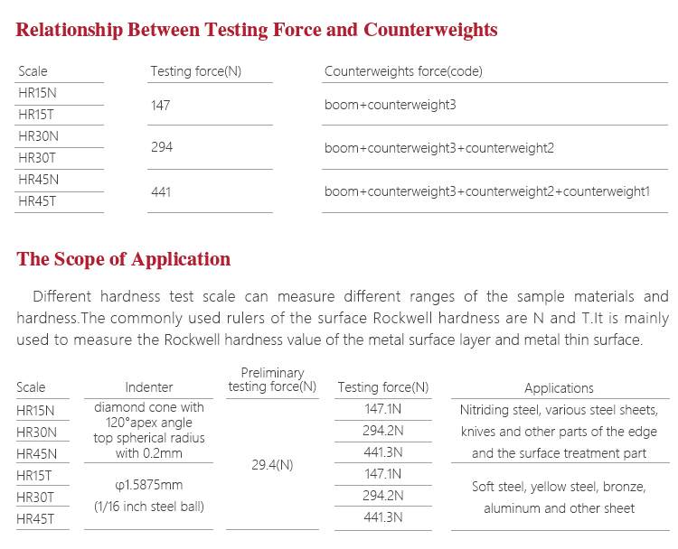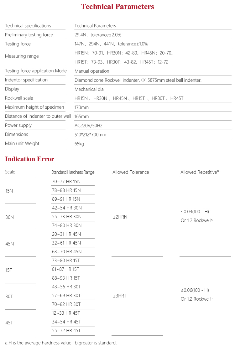 Indentor specification | Diamond cone Rockwell indenter, Φ1.5875mm steel ball indenter. |