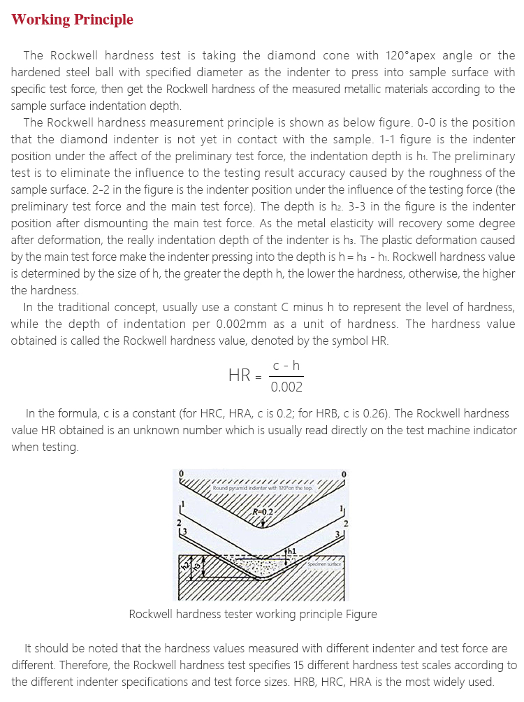 The Rockwell hardness measurement principle is shown as below figure. 0-0 is the position that the diamond indenter is not yet in contact with the sample. 1-1 figure is the indenter position under the affect of the preliminary test force, the indentation depth is h1. The preliminary test is to eliminate the influence to the testing result accuracy caused by the roughness of the sample surface. 2-2 in the figure is the indenter position under the influence of the testing force (the preliminary test force and the main test force). The depth is h2. 3-3 in the figure is the indenter position after dismounting the main test force. As the metal elasticity will recovery some degree after deformation, the really indentation depth of the indenter is h3. The plastic deformation caused by the main test force make the indenter pressing into the depth is h=h3-h1. Rockwell hardness value is determined by the size of h, the greater the depth h, the lower the hardness, otherwise, the higher the hardness.