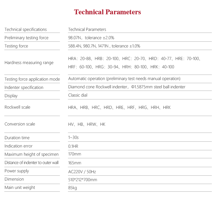 In the formula, c is a constant (for HRC, HRA, c is 0.2; for HRB, c is 0.26). The Rockwell hardness value HR obtained is an unknown number which is usually read directly on the test machine indicator when testing.