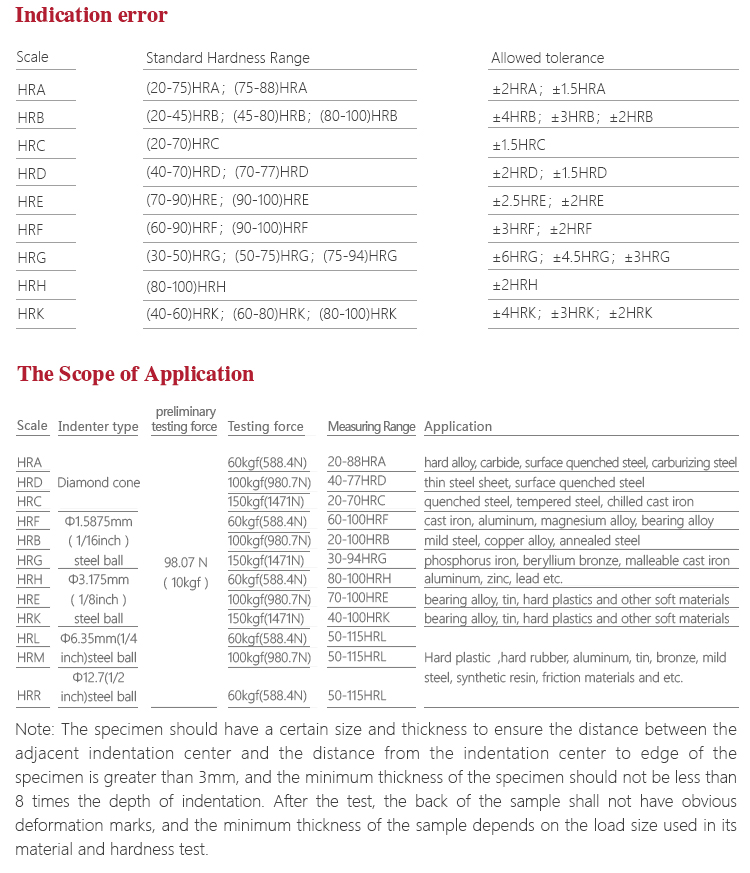 Hardness measuring range | HRA:20-88、HRB:20-100、HRC:20-70、HRD:40-77、 HRE:70-100、HRF:60-100、HRG:30-94、HRH:80-100、 HRK:40-100 |