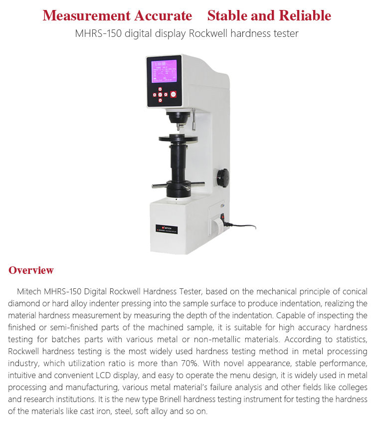 Mitech MHRS-150 Digital Rockwell Hardness Tester, based on the mechanical principle of conical diamond or hard alloy indenter pressing into the sample surface to produce indentation, realizing the material hardness measurement by measuring the depth of the indentation. Capable of inspecting the finished or semi-finished parts of the machined sample, it is suitable for high accuracy hardness testing for batches parts with various metal or non-metallic materials. According to statistics, Rockwell hardness testing is the most widely used hardness testing method in metal processing industry, which utilization ratio is more than 70%. With novel appearance, stable performance, intuitive and convenient LCD display, and easy to operate the menu design, it is widely used in metal processing and manufacturing, various metal material’s failure analysis and other fields like colleges and research institutions. It is the new type Brinell hardness testing instrument for testing the hardness of the materials like cast iron, steel, soft alloy and so on.