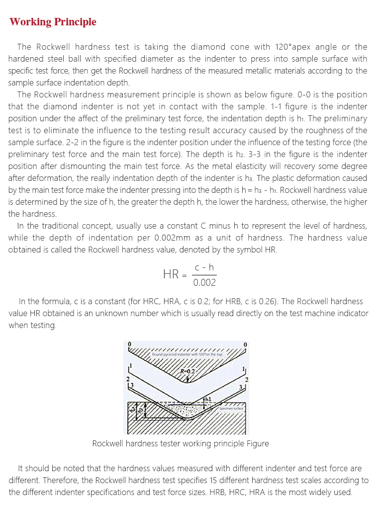 The Rockwell hardness test is taking the diamond cone with 120°apex angle or the hardened steel ball with specified diameter as the indenter to press into sample surface with specific test force, then get the Rockwell hardness of the measured metallic materials according to the sample surface indentation depth.