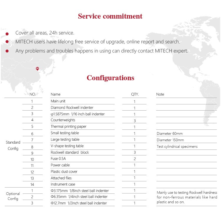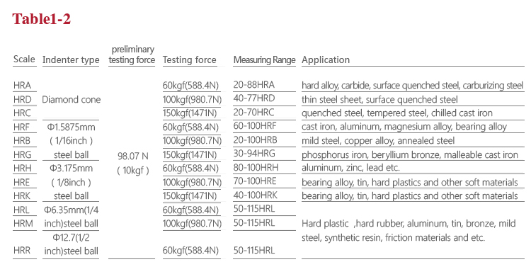 Measuring range | HRA:20-88、HRB:20-100、HRC:20-70、HRD:40-77、 HRE:70-100、HRF:60-100、HRG:30-94、HRH:80-100、 HRK:40-100、HRL |