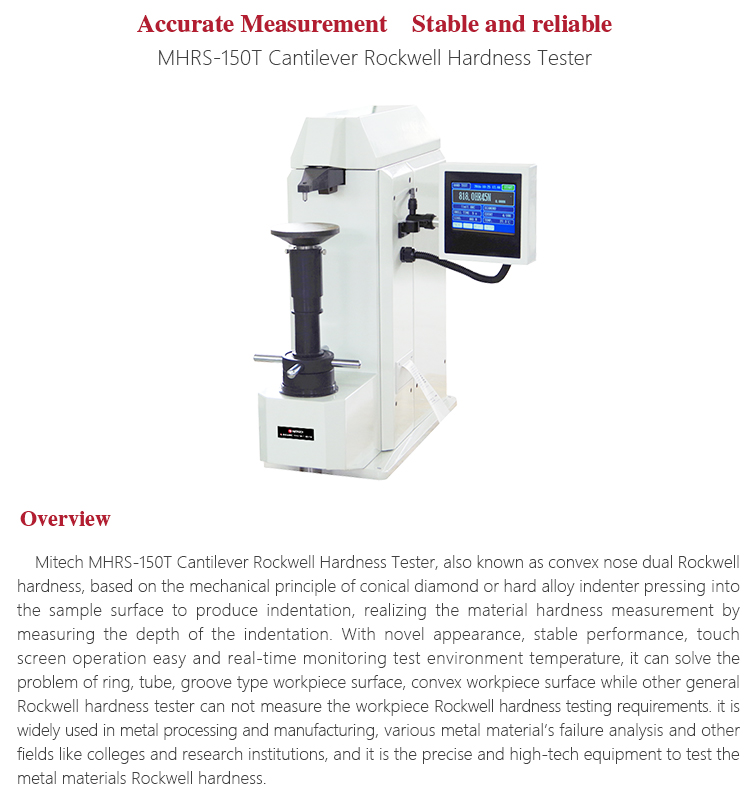 Mitech MHRS-150T Cantilever Rockwell Hardness Tester, also known as convex nose dual Rockwell hardness, based on the mechanical principle of conical diamond or hard alloy indenter pressing into the sample surface to produce indentation, realizing the material hardness measurement by measuring the depth of the indentation. With novel appearance, stable performance, touch screen operation easy and real-time monitoring test environment temperature, it can solve the problem of ring, tube, groove type workpiece surface, convex workpiece surface while other general Rockwell hardness tester can not measure the workpiece Rockwell hardness testing requirements. it is widely used in metal processing and manufacturing, various metal material’s failure analysis and other fields like colleges and research institutions, and it is the precise and high-tech equipment to test the metal materials Rockwell hardness.