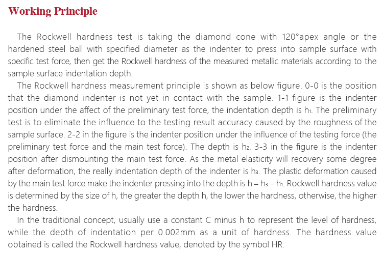 The Rockwell hardness measurement principle is shown as below figure. 0-0 is the position that the diamond indenter is not yet in contact with the sample. 1-1 figure is the indenter position under the affect of the preliminary test force, the indentation depth is h1. The preliminary test is to eliminate the influence to the testing result accuracy caused by the roughness of the sample surface. 2-2 in the figure is the indenter position under the influence of the testing force (the preliminary test force and the main test force). The depth is h2. 3-3 in the figure is the indenter position after dismounting the main test force. As the metal elasticity will recovery some degree after deformation, the really indentation depth of the indenter is h3. The plastic deformation caused by the main test force make the indenter pressing into the depth is h=h3-h1. Rockwell hardness value is determined by the size of h, the greater the depth h, the lower the hardness, otherwise, the higher the hardness.