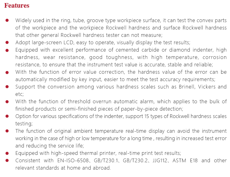 l Option for various specifications of the indenter, support 15 types of Rockwell hardness scales testing;