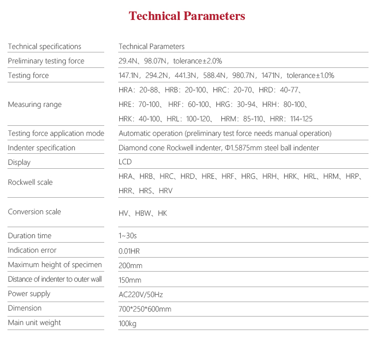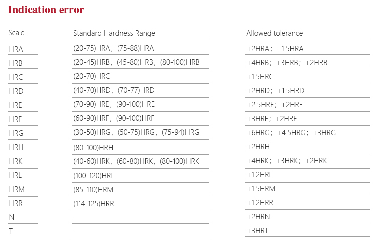 Measuring range | HRA:20-88、HRB:20-100、HRC:20-70、HRD:40-77、 HRE:70-100、 HRF:60-100、HRG:30-94、HRH:80-100、HRK:40-100、HRL |