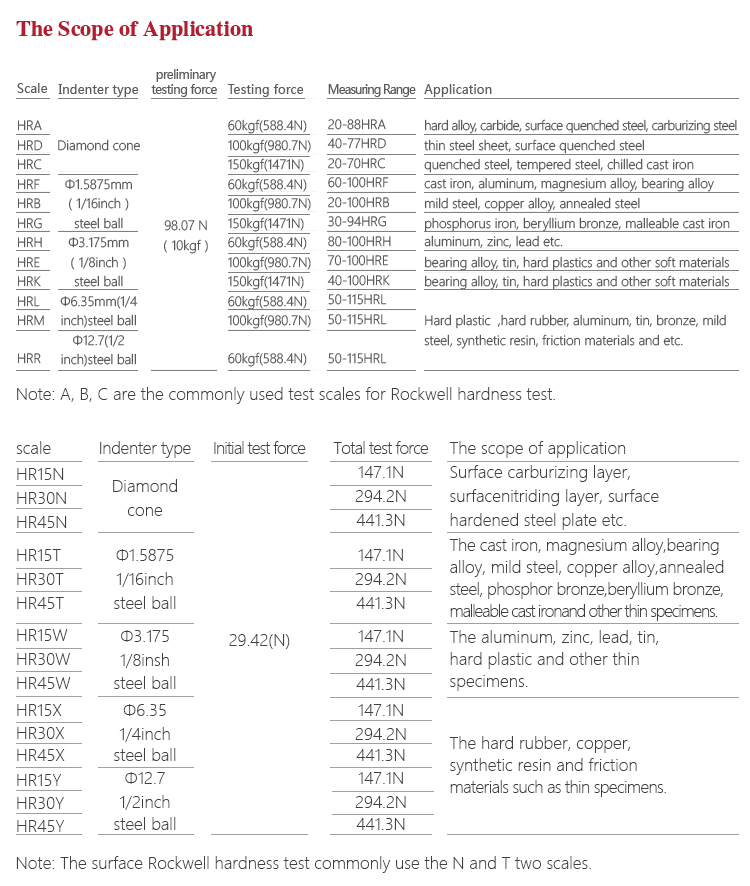 It should be noted that the measured hardness values would be different with different indenter and test force. Therefore, the Rockwell hardness testing specifies 15 different hardness test scales according to the different indenter specification and test force sizes. And the HRB, HRC, HRA are the most widely used.