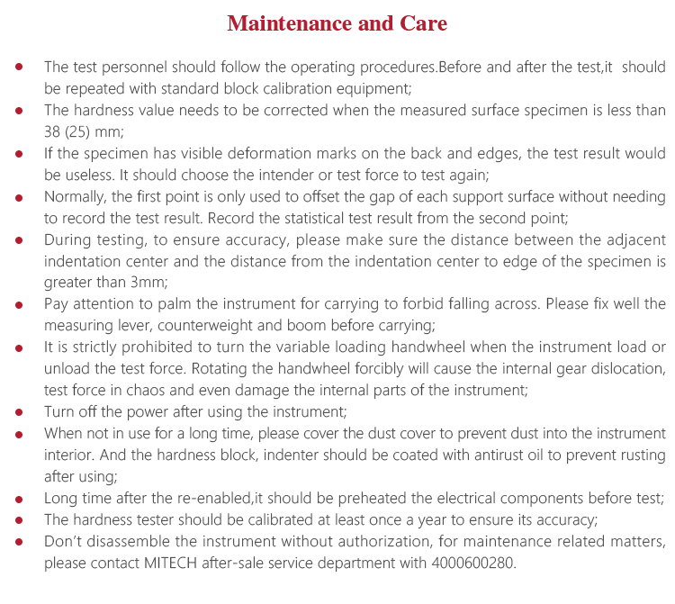 l The hardness tester should be calibrated at least once a year to ensure its accuracy;