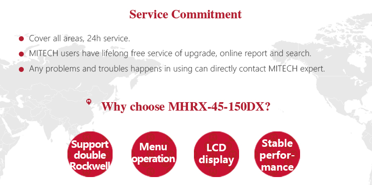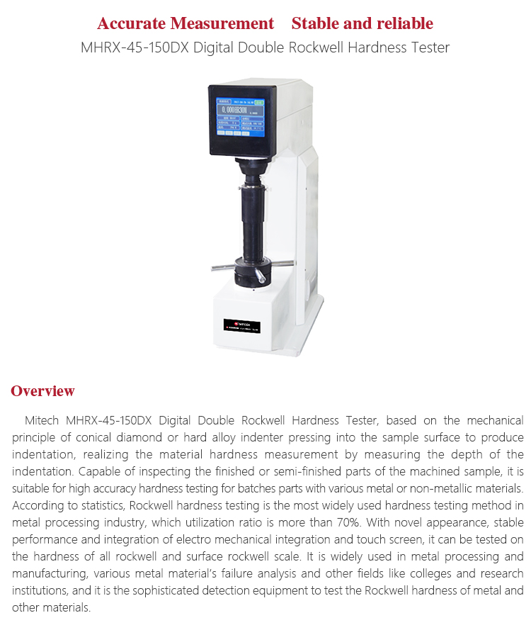 Mitech MHRX-45-150DX Digital Double Rockwell Hardness Tester, based on the mechanical principle of conical diamond or hard alloy indenter pressing into the sample surface to produce indentation, realizing the material hardness measurement by measuring the depth of the indentation. Capable of inspecting the finished or semi-finished parts of the machined sample, it is suitable for high accuracy hardness testing for batches parts with various metal or non-metallic materials. According to statistics, Rockwell hardness testing is the most widely used hardness testing method in metal processing industry, which utilization ratio is more than 70%. With novel appearance, stable performance and integration of electro mechanical integration and touch screen, it can be tested on the hardness of all rockwell and surface rockwell scale. It is widely used in metal processing and manufacturing, various metal material’s failure analysis and other fields like colleges and research institutions, and it is the sophisticated detection equipment to test the Rockwell hardness of metal and other materials.