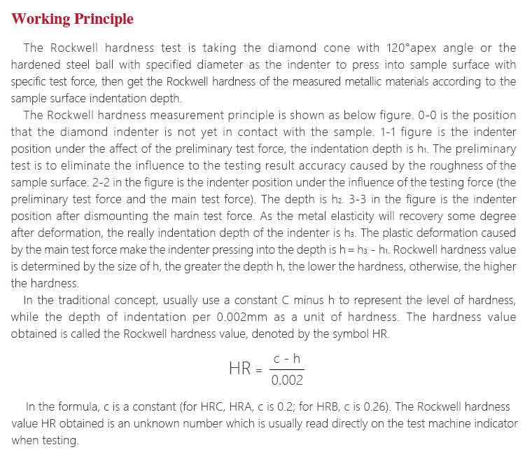 The Rockwell hardness measurement principle is shown as below figure. 0-0 is the position that the diamond indenter is not yet in contact with the sample. 1-1 figure is the indenter position under the affect of the preliminary test force, the indentation depth is h1. The preliminary test is to eliminate the influence to the testing result accuracy caused by the roughness of the sample surface. 2-2 in the figure is the indenter position under the influence of the testing force (the preliminary test force and the main test force). The depth is h2. 3-3 in the figure is the indenter position after dismounting the main test force. As the metal elasticity will recovery some degree after deformation, the really indentation depth of the indenter is h3. The plastic deformation caused by the main test force make the indenter pressing into the depth is h=h3-h1. Rockwell hardness value is determined by the size of h, the greater the depth h, the lower the hardness, otherwise, the higher the hardness.