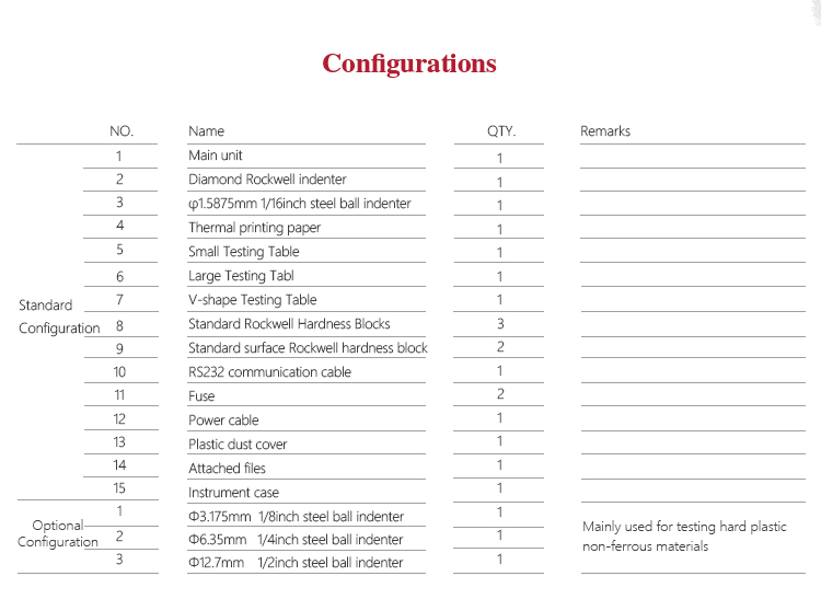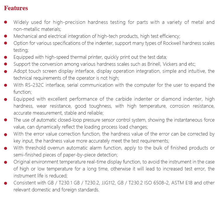 l Option for various specifications of the indenter, support many types of Rockwell hardness scales testing;