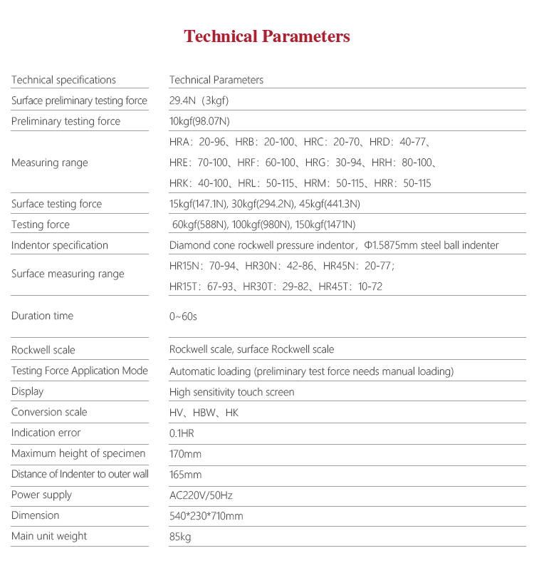 Surface measuring range | HR15N:70-94、HR30N:42-86、HR45N:20-77; HR15T:67-93、HR30T:29-82、HR45T:10-72 |