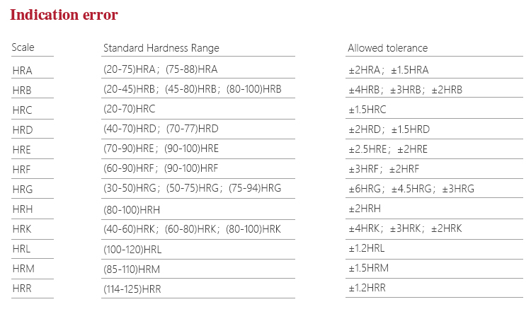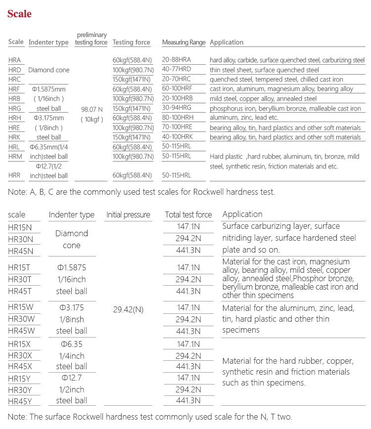 Measuring range | HRA:20-96、 HRB:20-100、HRC:20-70、 HRD:40-77、 HRE:70-100、HRF:60-100 HRG:30-94、 HRH:80-100、HRK:40-100、 |