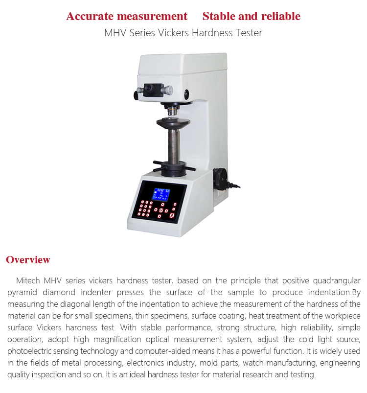 Mitech MHV series vickers hardness tester, based on the principle that positive quadrangular pyramid diamond indenter presses the surface of the sample to produce indentation.By measuring the diagonal length of the indentation to achieve the measurement of the hardness of the material can be for small specimens, thin specimens, surface coating, heat treatment of the workpiece surface Vickers hardness test. With stable performance, strong structure, high reliability, simple operation, adopt high magnification optical measurement system, adjust the cold light source, photoelectric sensing technology and computer-aided means it has a powerful function. It is widely used in the fields of metal processing, electronics industry, mold parts, watch manufacturing, engineering quality inspection and so on. It is an ideal hardness tester for material research and testing.